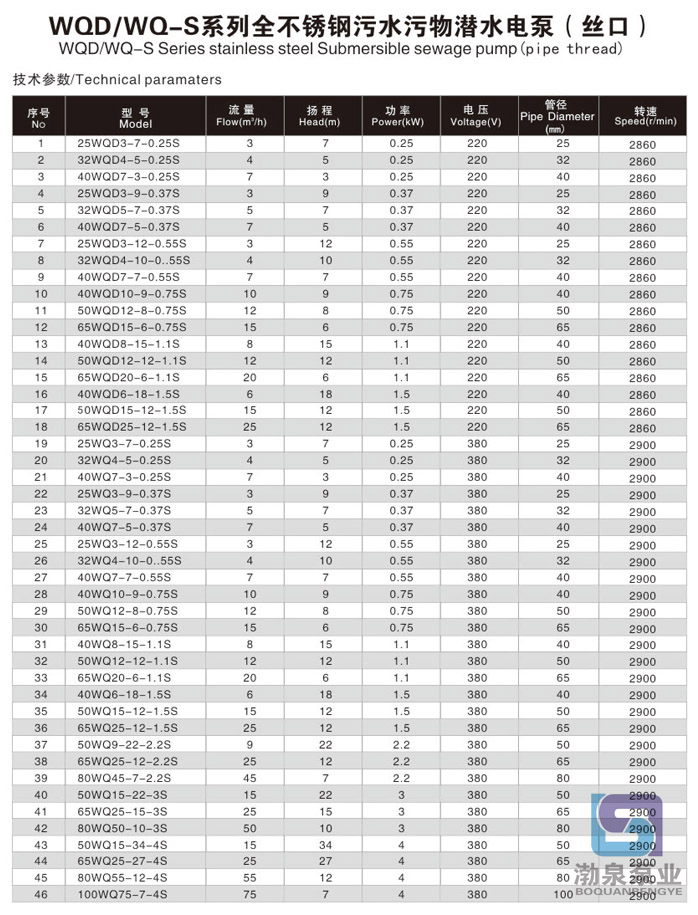 产品介绍 产品概述: 1、25WQ3-7-0.25S 丝口不锈钢潜水排污泵采用独特的单、双流道式叶轮结构,大大提高了污物的通过能力,根据产品型号能通 过 泵口径 5倍的纤维与直径约为泵出口口径50%的固体颗粒。 2、采用氟橡胶双端面机封,氟橡胶径向O型圈密封,有效地对环境恶劣的液体进行密封保护作用。 3、采用精密铸造泵壳,重量轻、耐腐蚀、节能型、外形美观、检修方便,无需建泵房,潜入水中即可工作,减少工程造价。 4、排污泵内安装过热与电流保护器,防止电机过载发热。 5、可根据客户特殊要求定制防腐蚀电缆线、四氟机封,及高温液体的零件配置。 使用条件: 1、以叶轮中心为准,潜入水下深度不得超过5m。 2、输送介质温度不高于60℃。 3、输送介质的PH值304(4-10),316(2-13). 产品用途: 不锈钢排污泵适用于建筑楼宇、医院、住宅小区、市政工程、道路交通及施工、工厂排污、养殖、药业、饮料、海水盐水、一般腐蚀性介质中含有的固体颗粒、长纤维废水、污水。 产品优势: 25WQ3-7-0.25S 丝口不锈钢潜水排污泵采用独特的单双流道式叶轮结构,氟橡胶双端面机封、氟橡胶O型圈密封,不锈钢焊接转子轴,以及不锈钢精密铸造外壳。其中,国标法兰系列采用双端面、单端面双套机封密封。该产品能有效地在恶劣的液体环境下工作,具有耐腐蚀、耐高温等特点。特别适用于化粪池、化工液体、海水排涝等场合。 ![]() 因产品生产批次、型号不同,产品图片及安装尺寸仅供参考,详情可联系我们的销售人员了解更多40WQ7-3-0.25S 丝口系列潜水排污泵相关信息!