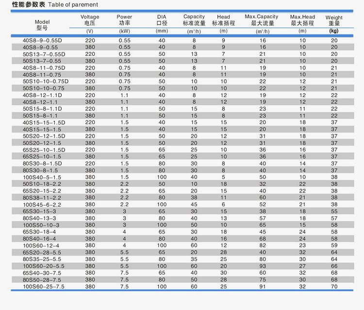 | 50S10-10-0.75耐腐耐酸碱304不锈钢潜水排污泵 | ||||||||||||||||